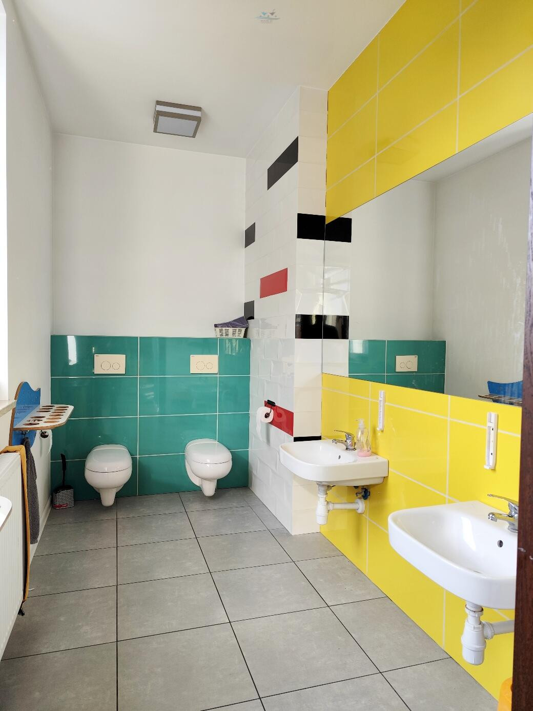 Lokal obejmuje całe skrzydło (połowę) piętra oraz część wspólną w korytarzu z WC i składa się z dwóch dużych sal/pomieszczeń, korytarza, zaplecza biurowego, pomieszczenia kuchennego, 2 łazienek (w tym jednej do przeróbki).