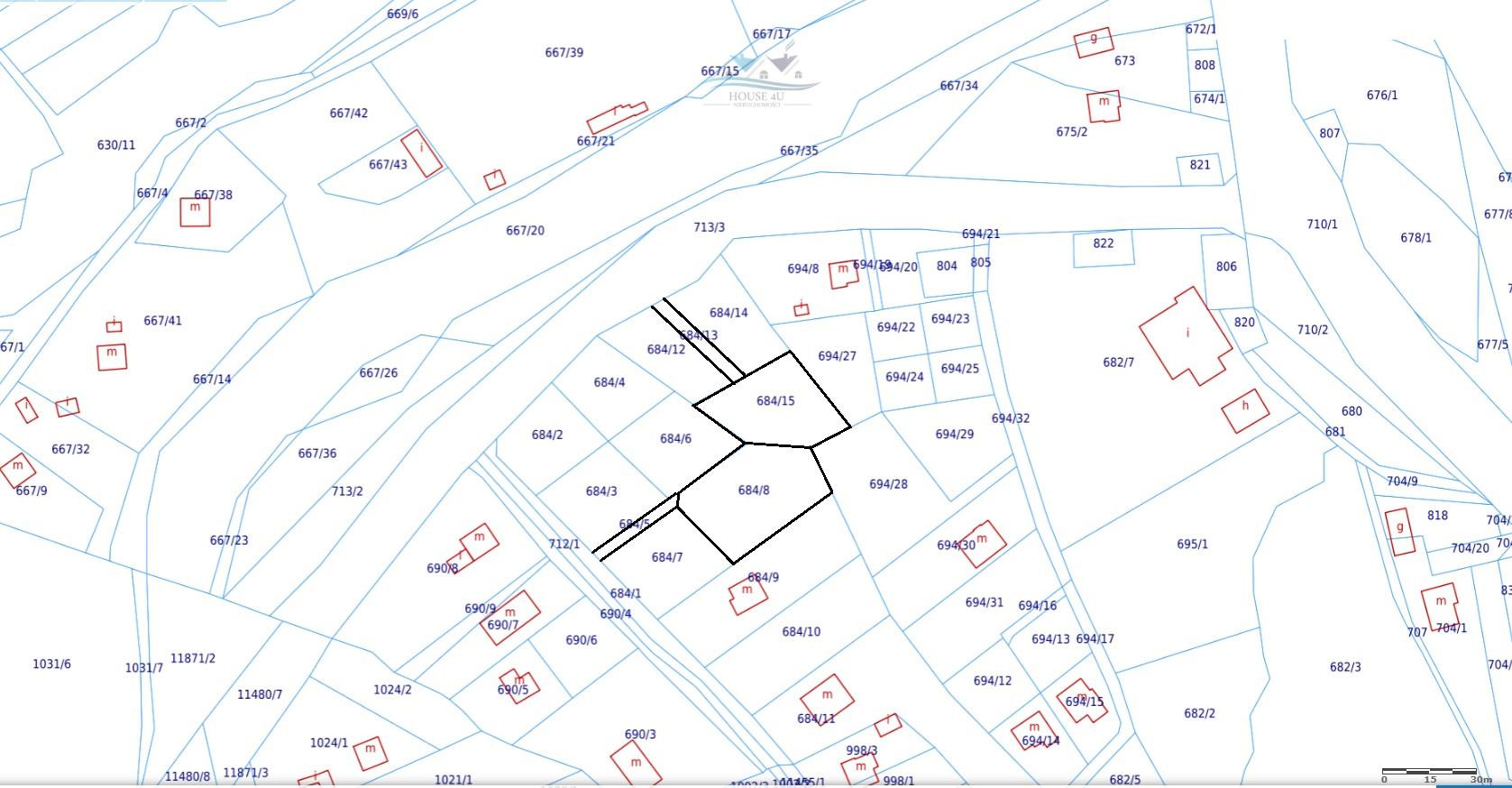 Działki mają numery 684/15 oraz 684/8 (drogi dojazdowe 684/13 oraz 684/5)