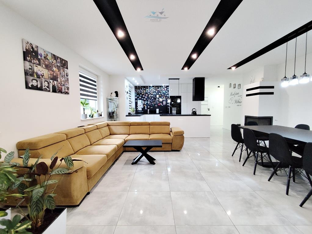 Przestronny i otwarty salon z kominkiem połączony z jadalnią i kuchnią o powierzchni łącznej 50m2, 5 samodzielnych sypialni (w tym 2 z garderobami), spiżarnia, garderoba i 2 łazienki z WC, 2 x hall, wiatrołap oraz osobny garaż i murowana altana.